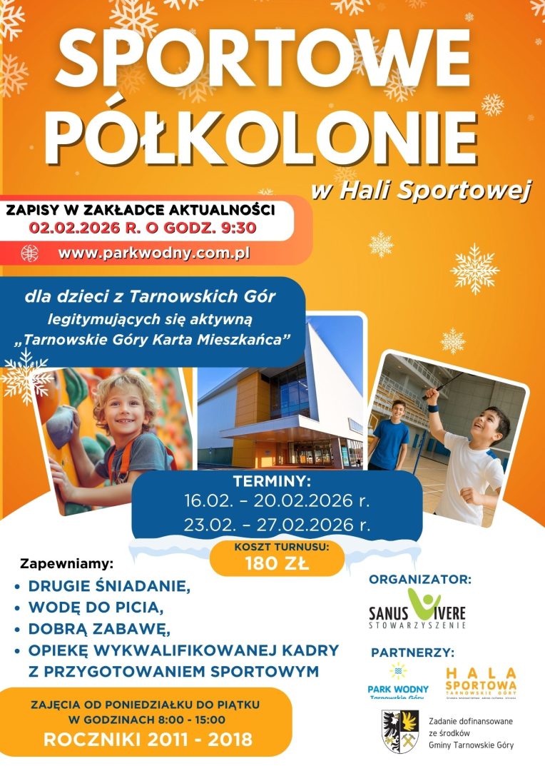 Półkolonie współfinansowane są przez Urząd Miasta Tarnowskie Góry. W programie: gry i zabawy, squash, ścianka wspinaczkowa, basen, lodowisko (w razie sprzyjających warunków pogodowych)